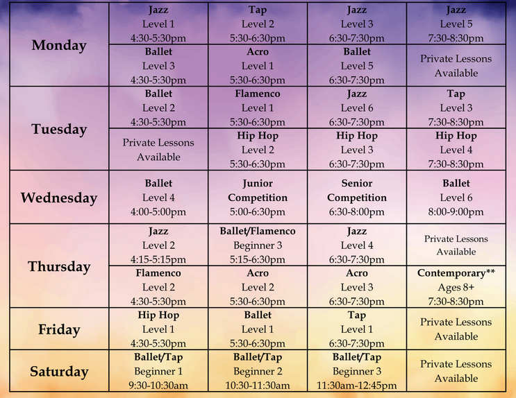 Classes are based on age and level. Please speak with the office for the best class for your child.